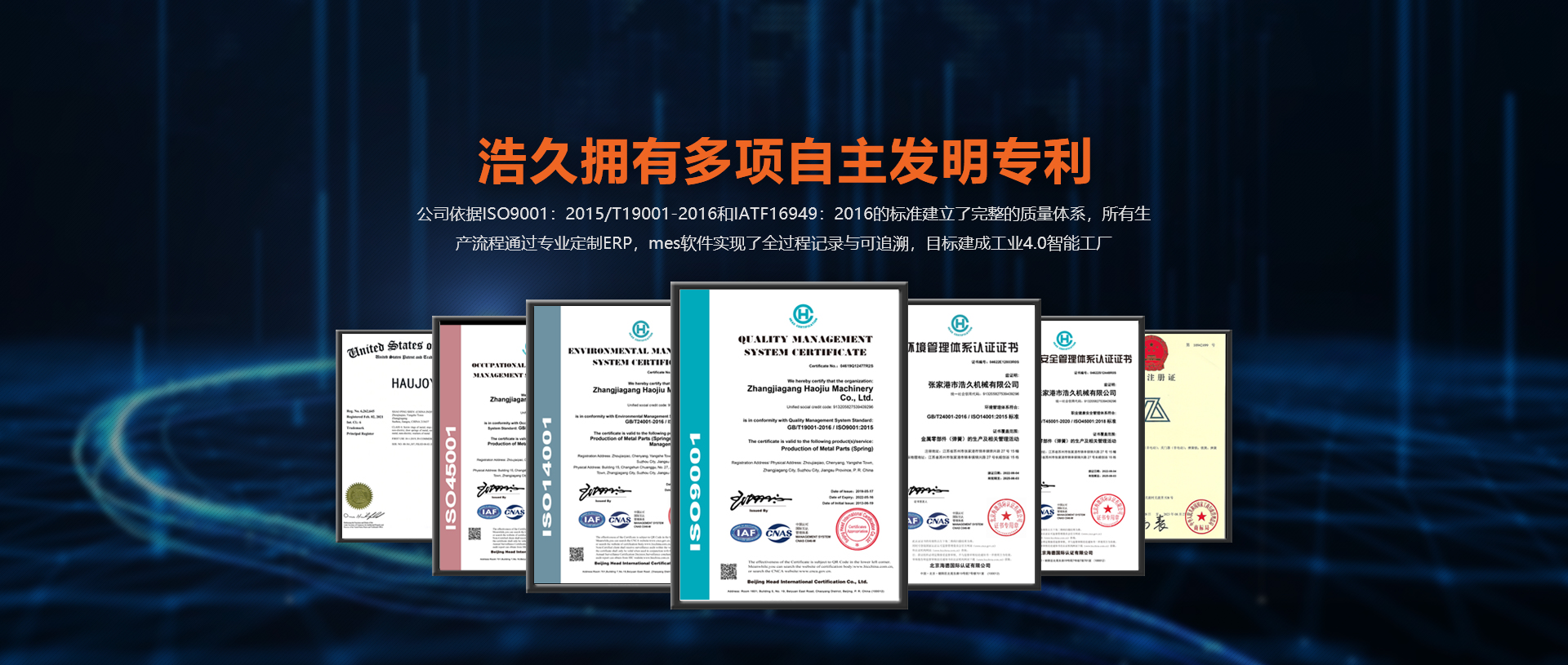 浩久擁有多項(xiàng)自主發(fā)明專利。公司依據(jù)ISO9001GB/T19001-2016和IATF:2016的標(biāo)準(zhǔn)建立了完整的質(zhì)量體系,所有生產(chǎn)流程通過(guò)專業(yè)定制ERP,mes軟件實(shí)現(xiàn)了全過(guò)程記錄與可追溯,目標(biāo)建成工業(yè)4.0智能工廠。